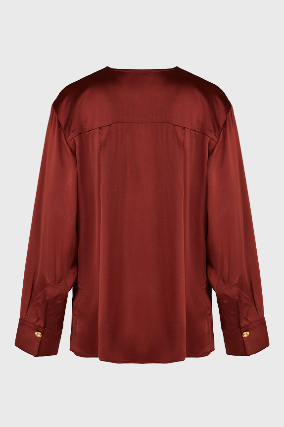 Блуза свободного кроя от TAMI GEE сочетает элегантность и детали: V-образный вырез с декоративными пуговицами, рукава рубашечного кроя с манжетами и отделкой «кувшин» — ДНК бренда, повторяющейся по бокам с эффектными разрезами.