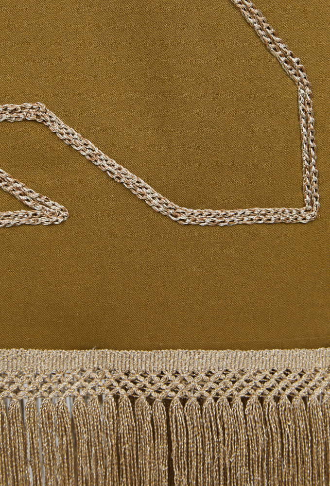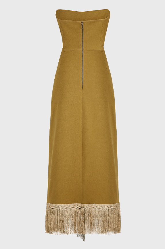 Корсетное платье с имитацией запаха и бахромой от TAMI GEE воплощает союз традиций Востока и современных тенденций. Трапециевидная миди-юбка создает изящный силуэт, подчеркивая женственность и утонченность. Открытая линия декольте добавляет чувственности, а застежка-молния сзади обеспечивает идеальную посадку.