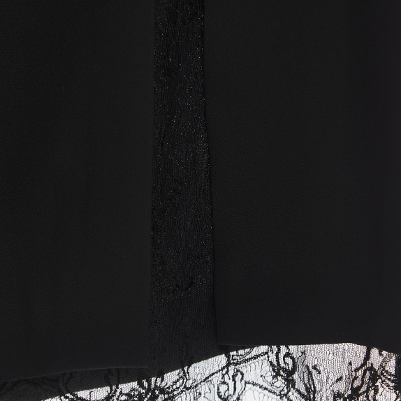 Платье‑футляр длины миди с кружевной отделкой. V-образный вырез с декоративным воротником-стойка из кружева. Застежка на потайную молнию сзади. Подкладка из натурального шелка.