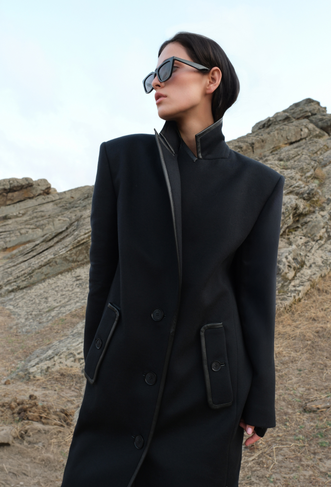 Однобортное пальто в трендовом мужском стиле. Выполнено в насыщенном чёрном цвете из плотной шерсти. Ставка на архитектурный маскулинный крой воплощает строгую эстетику фирменного костюмного пиджака. Шёлковый подклад добавляет изысканности. Узкий кант из мягкой чёрной кожи подчеркивает прямой силуэт. Завершающий элемент - крупные пуговицы с логотипом бренда. Такое пальто создаст эффектное звучание любому образу.