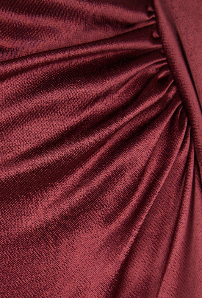 Юбка сложного кроя с ассиметричной драпировкой спереди от TAMI GEE подчёркнута поясом на обтачке. Длины миди. Застегивается на потайную молнию сбоку. Без подклада, в глубоком бордовом оттенке.