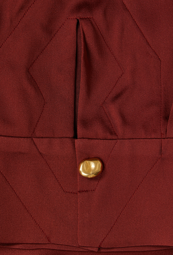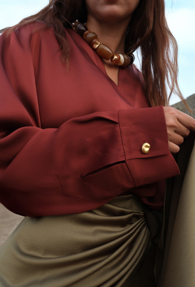 Блуза свободного кроя от TAMI GEE сочетает элегантность и детали: V-образный вырез с декоративными пуговицами, рукава рубашечного кроя с манжетами и отделкой «кувшин» — ДНК бренда, повторяющейся по бокам с эффектными разрезами.