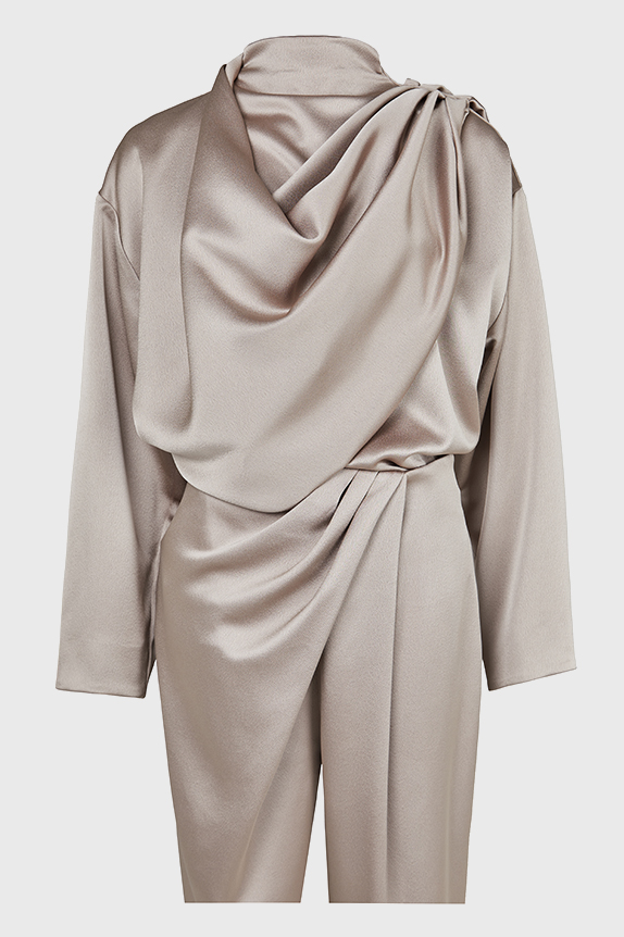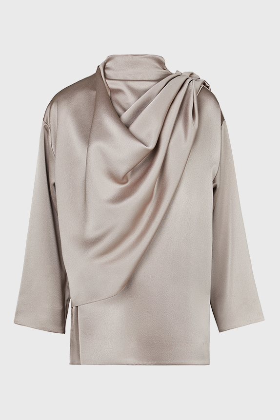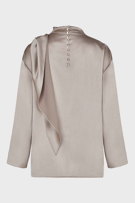 Блуза свободного силуэта от TAMI GEE — минимализм с восточными деталями и точным кроем. В качестве деталей - воротник стойка, шлейф-запах, который драпируется к плечевому шву. Застёжка сзади на длинный ряд пуговиц. К блузе мы выпустили брюки с запахом, чтобы создавать цельный образ было еще проще.