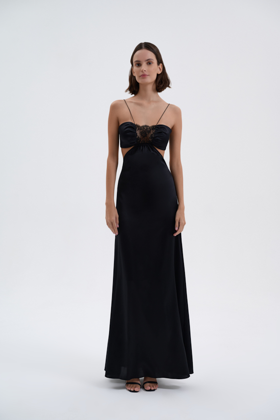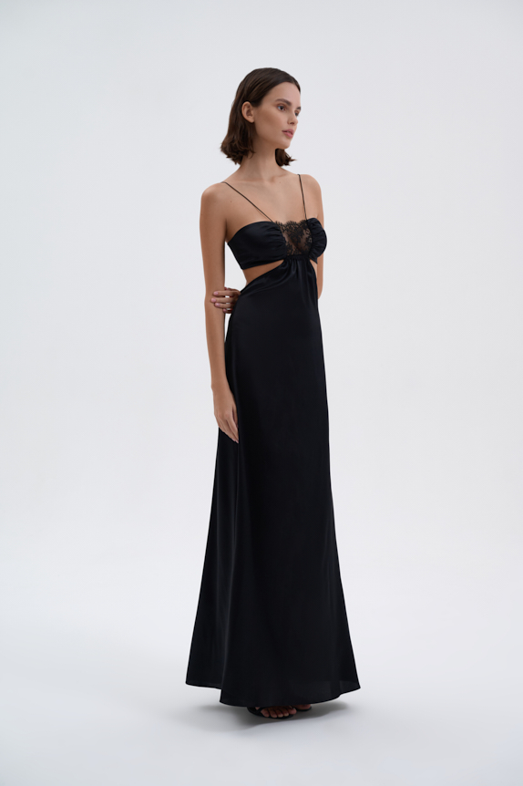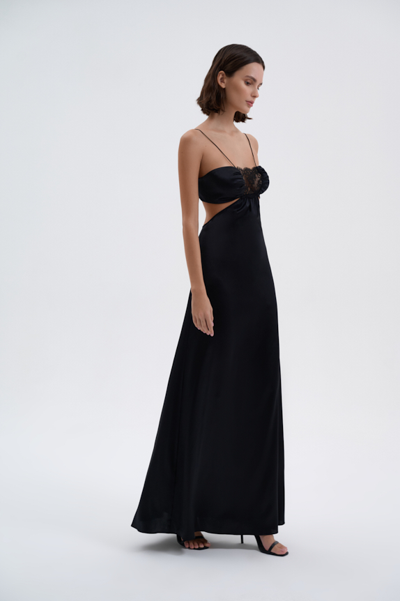 Платье комбинация — одна из тех вещей, которые сразу попадают в центр внимания. Для пошива изделия со скульптурной драпировкой используется тонкий угольно-чёрный шёлк, который едва ощущается на теле. Акцентом под лучами света вспыхивает прозрачное кружево в зоне лифа. Также соблазнительности образу добавляют разрезы на талии.