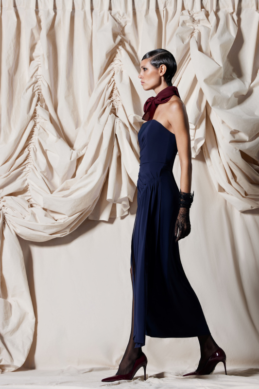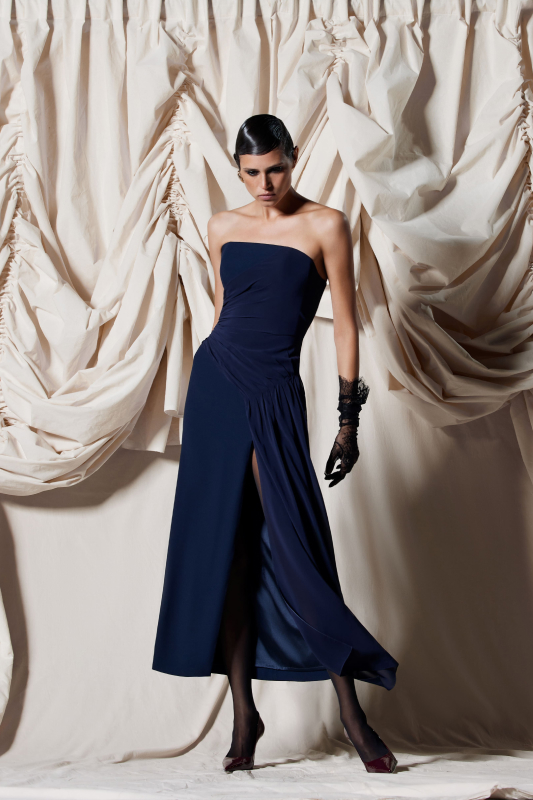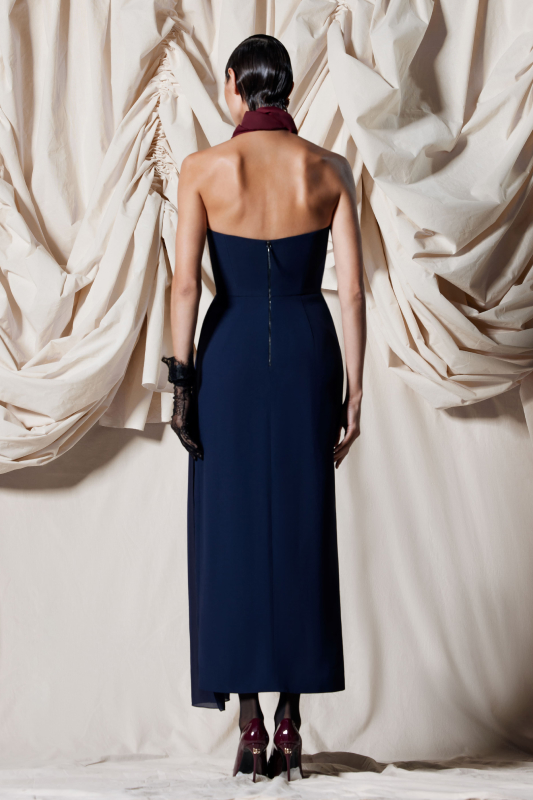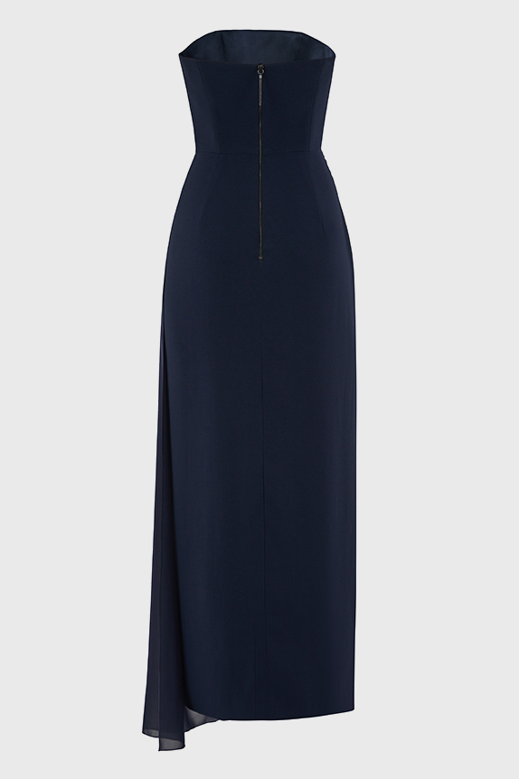 Это корсетное платье глубокого, словно волны Каспийского моря вдоль побережья Кавказа, темно-синего цвета с разрезом рассказывает чувственную историю контрастов. Драматичность и нежность, элегантность и чувственность. Драпированный полупрозрачный шифон, использованный в этом платье, не только придаёт образу легкость и воздушность, но и отсылает к традициям восточных культур, где подобные материалы всегда ассоциировались с грацией и движением. Корсетный верх аккуратно формирует безупречный силуэт, выделяя талию и создавая эффектную линию декольте, изящный разрез и плавные линии добавляют смелости и привлекают взгляды, подчеркивая изящество женской фигуры. Каждая деталь этого платья создана для того, чтобы вы чувствовали себя уверенно и неповторимо, излучая силу и женственность в каждом движении.