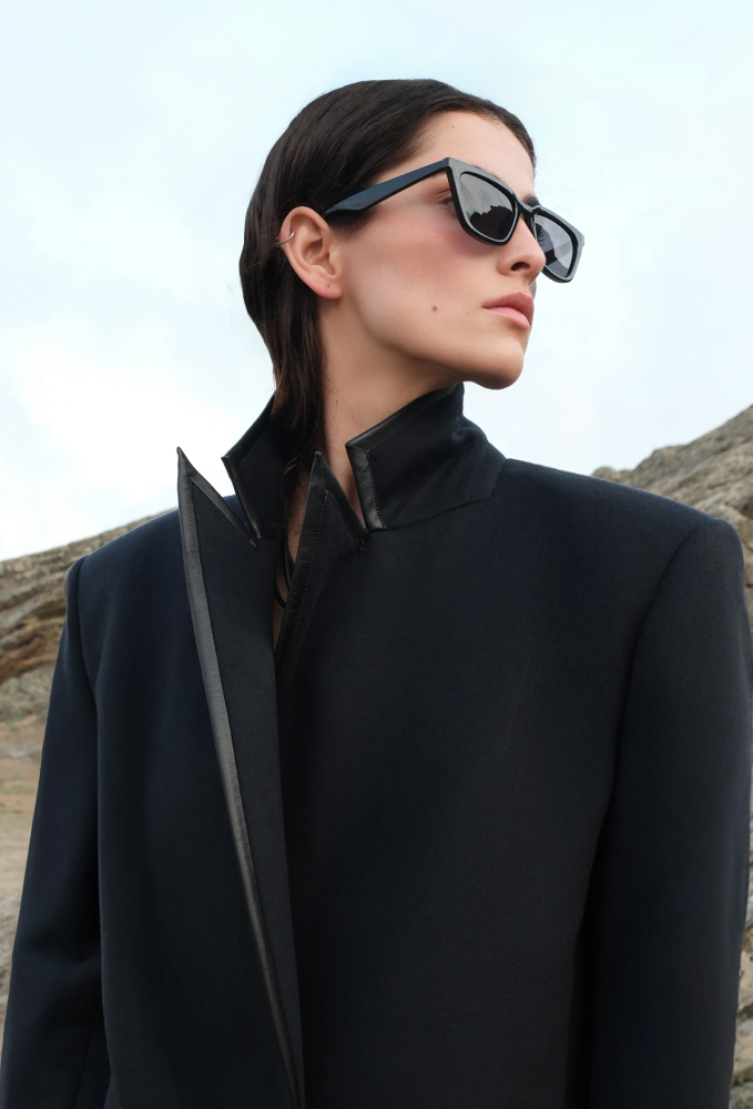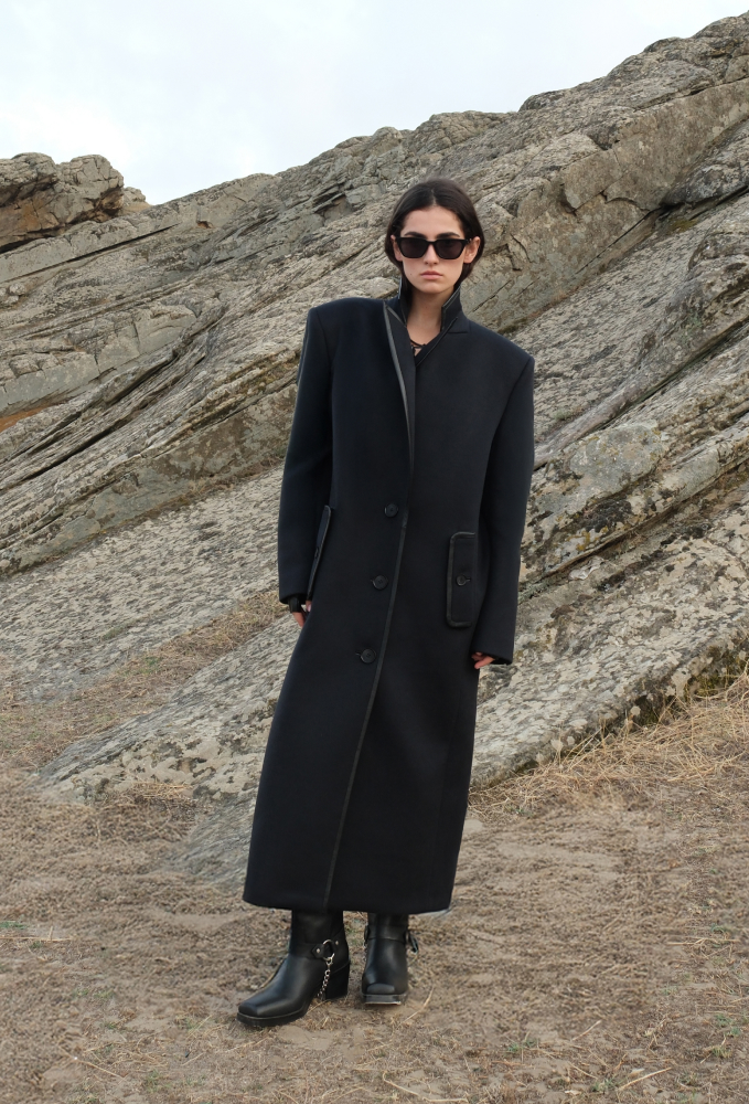 Однобортное пальто в трендовом мужском стиле. Выполнено в насыщенном чёрном цвете из плотной шерсти. Ставка на архитектурный маскулинный крой воплощает строгую эстетику фирменного костюмного пиджака. Шёлковый подклад добавляет изысканности. Узкий кант из мягкой чёрной кожи подчеркивает прямой силуэт. Завершающий элемент - крупные пуговицы с логотипом бренда. Такое пальто создаст эффектное звучание любому образу.