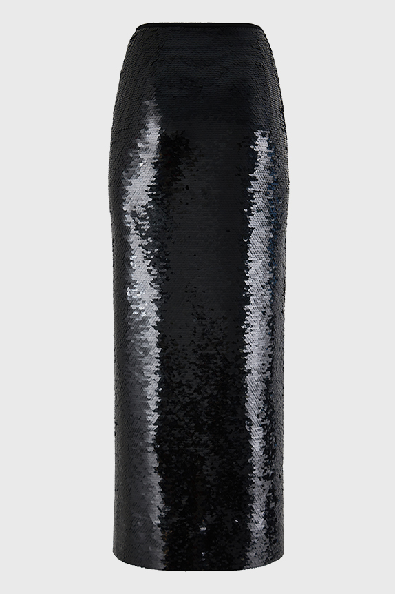 Сверкающие пайетки — беспроигрышный способ привлечь внимание. Но достоинства черной юбки из вечерней коллекции на этом не заканчиваются. Их свойства усиливаются скульптурным кроем изделия. Выверенные линии формируют безупречный прямой силуэт. Его подчеркивает макси длина. Идеальную пару юбке составят кроп-топ из пайеток и шелковая блуза.