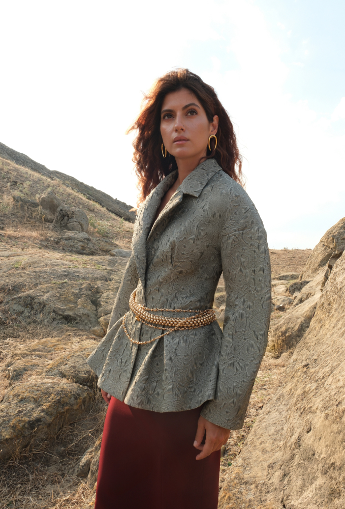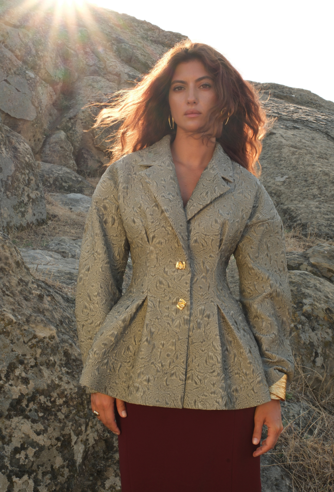 Жакет TAMI GEE из жаккарда с приталенным силуэтом и складками на талии подчёркивает женственность. Отложной воротник с классическими лацканами придаёт элегантность, а объёмный рукав со спущенным плечом придает лёгкость образу.