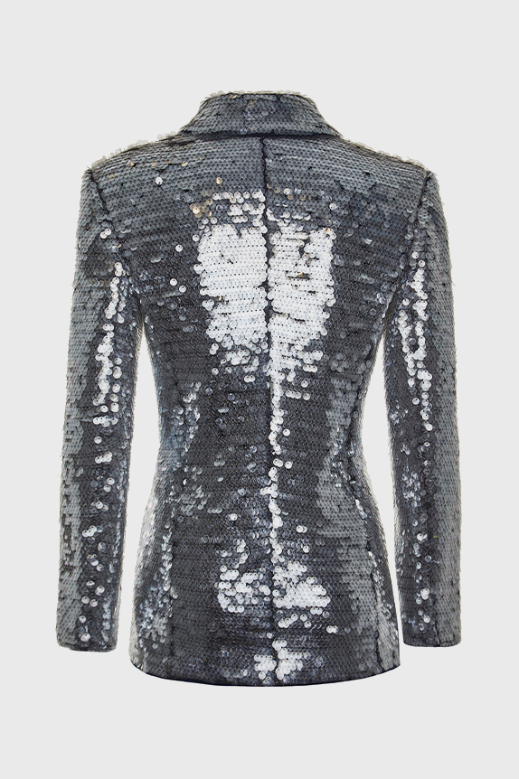 Жакет из пайеточной ткани полуприлегающего силуэта с прорезными карманами с клапанами. Застежка встык на крючках по центру переда создает изысканный вид. Английский отложной воротник. Подкладка из натурального шелка.
